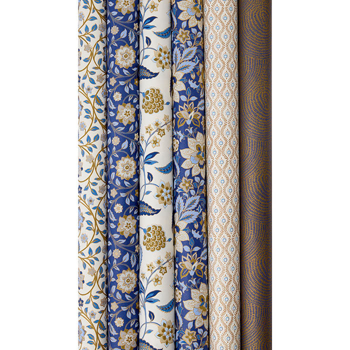 Sæt af håndlavet papir med dekorativt print i blå nuancer. I hver pakke får du 6 forskellige fantastiske print på 6 store ark.