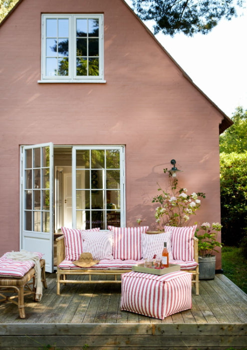 Vores Rimini striber er lavet med indfarvet garn, hvilket betyder, at striberne er vævet ind i stoffet. Fyldet i vores madrasser og siddehynder er lavet af genbrugt polyester.